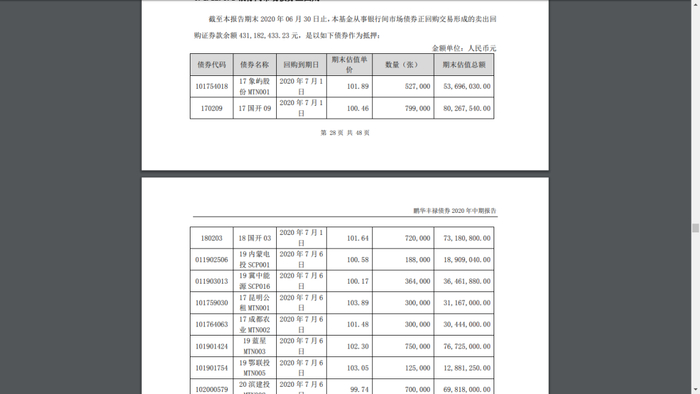 我翻阅债券型基金的半年报与年报,发现了一个增量的信息来源,那就是若债券型基金进行了杠杆操作,我们会额外获得银行间债券正回购名单。除了短债基金,不少债券型基金都有一定的正回购操作,债券指数基金也不例外。我把纯债投资排雷的重任寄托在了这一增量信息上,但遗憾的是这一次我无功而返了。