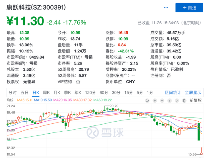 11月25日,康跃科技的龙虎榜中,财通证券青岛分公司位居卖二位置,交易金额988万元。康跃科技的二级市场走势与仁东控股的几乎一致。该股11月25日大跌20%,11月26日再度大跌逾17%。