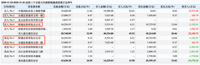 而在卖出席位,财通证券青岛分公司、长城证券惠州文明一路分别位列第一位、第二位,交易金额与买入一模一样。这是典型的回转操作。