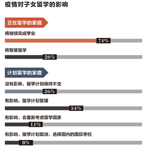 国际教育的需求,作为高净值家庭中长期规划,并未改变。疫情不会改变留学规划,但或推迟留学阶段,国内国际学校或成为过渡站。对于正在留学的家庭,超过七成选择继续完成学业,26%选择暂缓留学。对于计划留学的家庭,超过九成家庭不会取消留学规划,但留学时间点会考虑推迟。