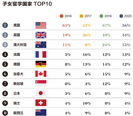 美国(56%)、英国(44%)仍然是中国高净值家庭首选的留学国家,加拿大吸引力在下降。专业选择上,最青睐商科(58%),其次是数学/计算机专业(31%)。