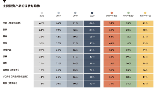 疫情后,金融投资热情比去年提高67%。储蓄和现金(86%)、股票(84%)、基金(78%)、保险(57%)及理财产品(54%)等配置热情均提升。