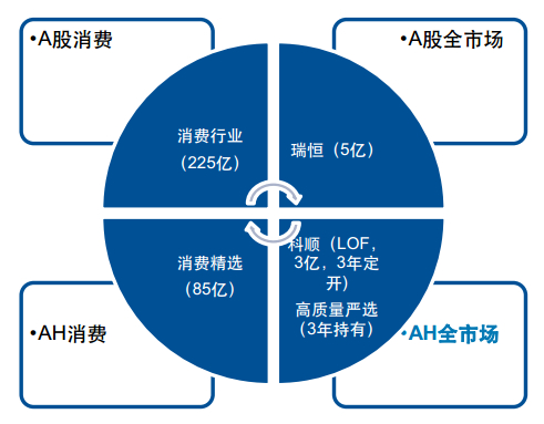 这里有一个产品的矩阵图,这个产品分为4大类,分别叫做A股消费基金、AH消费基金、A股全市场基金和A+H全市场基金,这是现在产品主要的4个板块。