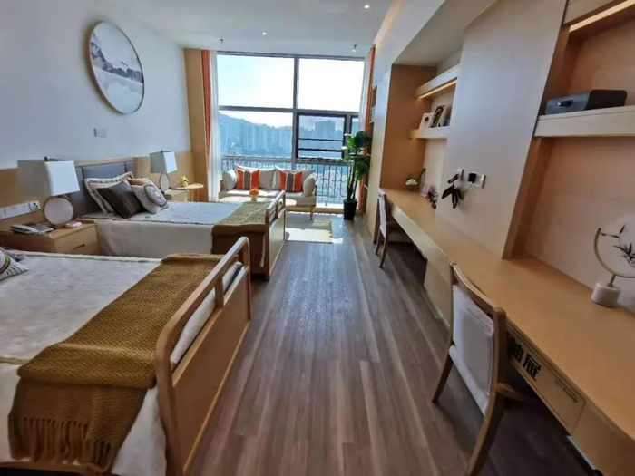 这三家养老院,其中两家养老院属于保险机构自营自建的项目,还有一家是大型央企旗下写字楼改造而成的。三家高端养老院各有特色,但除了护理服务外,养老院本质上跟年轻人住长租公寓没什么区别。