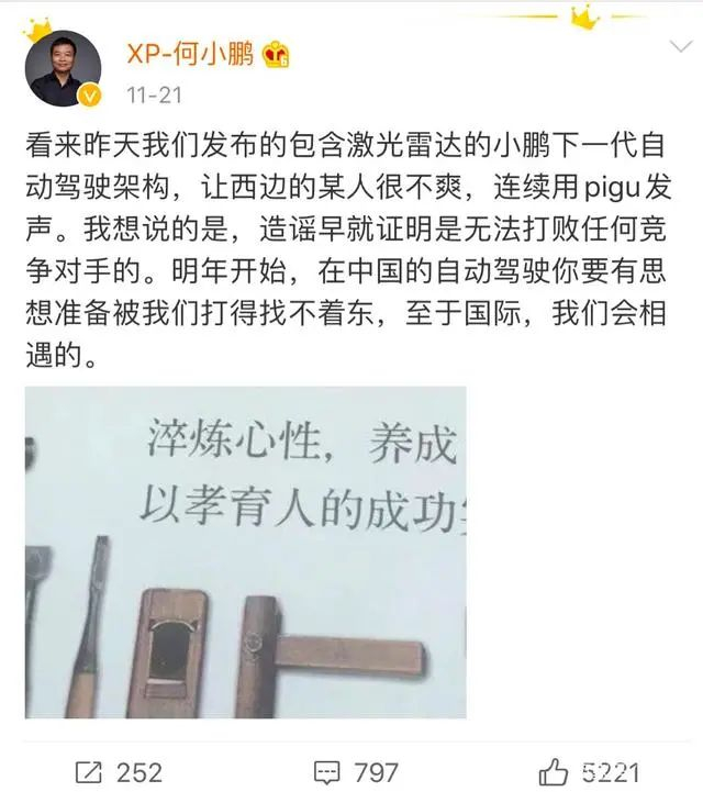 何小鹏这边其实可以不予置评,或者学习蔚来李斌,摆出欢迎切磋的姿态;但“打的找不着东”这样的表述就明显在放狠话,使得矛盾性升级。
