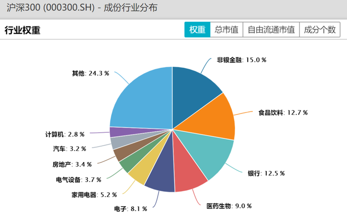 沪深300指数的前四大权重行业为:非银金融+食品饮料+银行+医药生物,是比较偏蓝筹价值的行业,四大行业总体权重占比较大,行业分布相对集中。在各行业内部,大部分成分股市值较大,具有较强的行业竞争优势,为行业龙头企业。