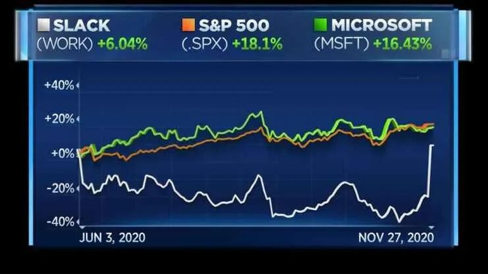 但是,尽管Slack成功让许多大公司开始使用该公司的即时通讯产品,但疫情之下,远程工作的兴起促进了Zoom和微软的相关业务增长,却并没有给Slack带来太多帮助。投资者对该公司的收入感到失望。从三月初到11月中旬,Slack的股价仅增长了10%。在Salesforce拟收购Slack的消息传出后,Slack的股价才大涨38%左右。而同一时期,Zoom的股价涨幅接近280%。