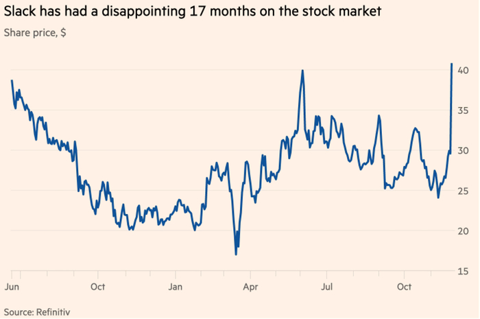 年初的时候,Slack错过了远程工作带来的大好机会。自上市以来,Slack的股价在17个月中下跌近四分之一。直到收购协商的消息传出,Slack的股价才有所起色。
