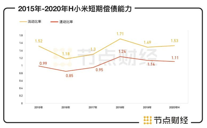 尽管资产负债率大起大落,但基于不断壮大的规模优势和较强的融资能力,小米的短期偿债能力保持稳定。2019年和2020年H1,其流动比率和速动比率分别为1.49和1.14,1.53和1.11,往前追溯,该指标自2015年起基本就维持在这一水平线,浮动极小。