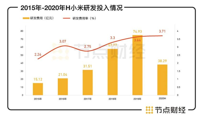 用数据佐证,公司研发费用从2016年的21.04亿元到2017年的31.51亿元,再到2018年的57.77亿元和2019年的74.93亿元,每年的增长率分别达到52.38%、81.25%和29.31%。2020年上半年,小米的研发投入为38.29亿元,同比增速达19.4%,研发费用率3.71%。