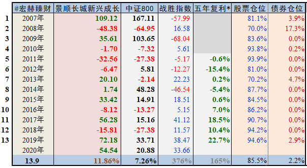 自2007以来至今13.9年时间,该基金累计收益率376%,同期中证800指数累计回报率为165%;平均股票仓位为85.5%,债券仓位2.2%;实现年均复利增长率为11.86%,同期指数为7.26%。经指数收益调节后年化收益率水平参考值【11.27%】
