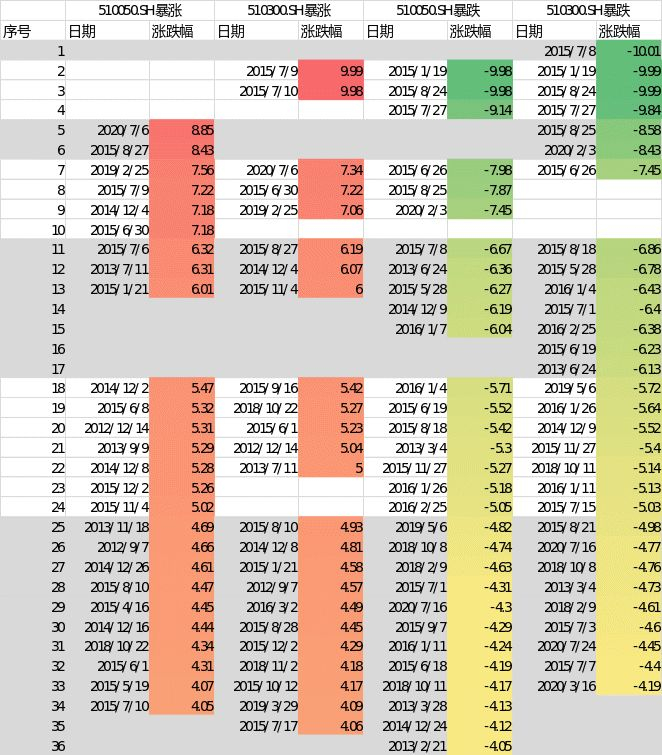 根据经验,我们假设当某一天市场出现涨跌幅超过4%的时候为极端行情,也就是尾部风险,对涨跌幅绝对值大于4%的情况进行统计,结果如表3所示: