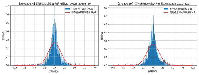 图 1:510050.SH和510300.SH的百分比收益率分布直方图