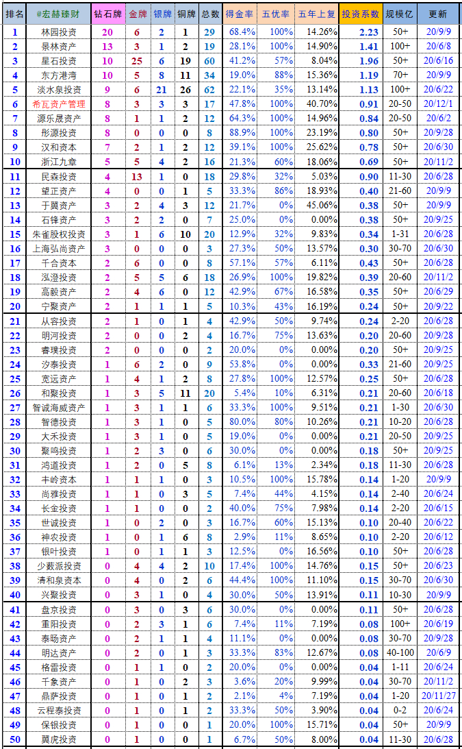 目前已经亮相登场过的私募基金斩获奖牌榜Top50