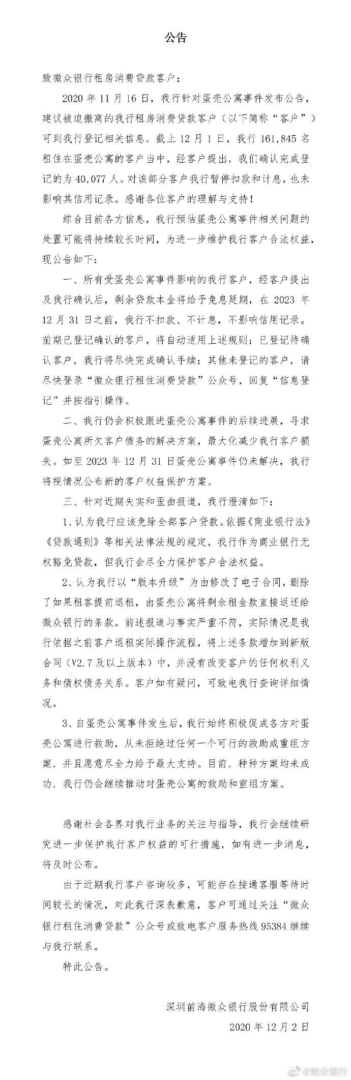 12月2日晚间,微众银行在微博发布关于蛋壳公寓租金贷偿还方案。
