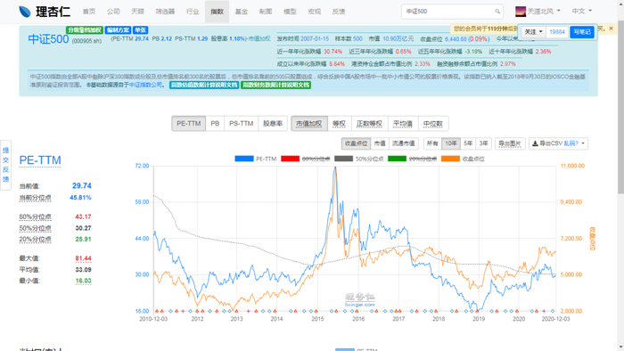 灰色线表示的中证500指数估值中枢近年来下行显著