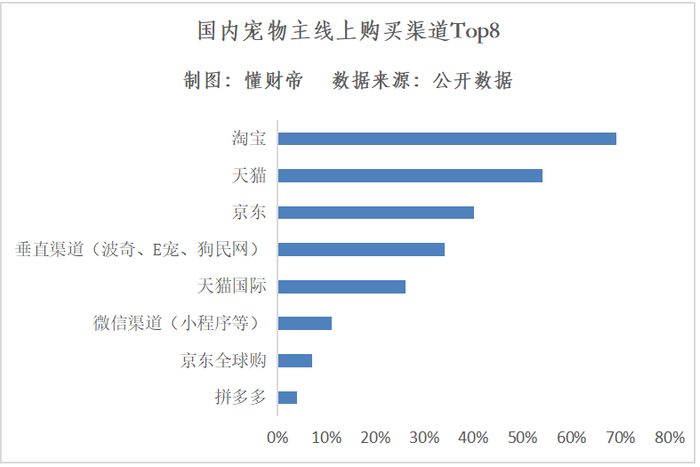 但国内目前完全不同,垂直电商占比很小。天猫、淘宝、京东等超级综合电商目前占据宠物电商更大份额。
