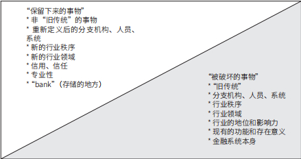 当然,现有金融机构的分支机构、人员和系统不会全部被破坏,他们会被重新定义,作为新的分支机构、人员和系统继续工作,这样就会产生新的行业秩序,产生新的行业领域。