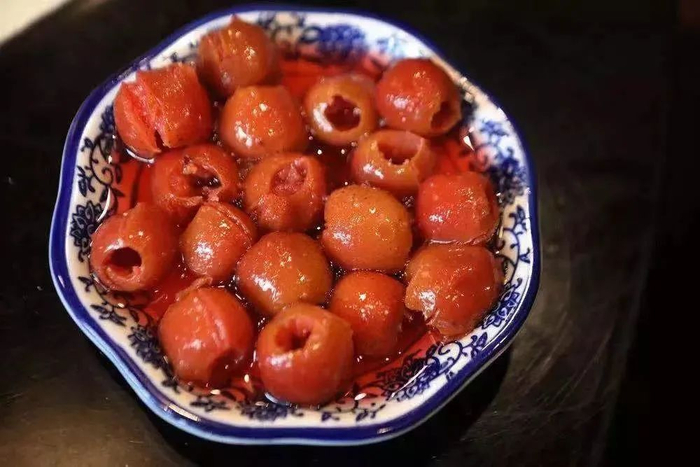 炒红果则只是北京有,我觉得很好,虽然假如自己家里来制造自然还要好,至少是会软得多。这同冰糖葫芦用的是一样的材料,煮熟剥皮去核,加糖再煮,并不曾炒,却叫做炒红果。这红果的名称也是与乡下方言相合的,北京普通称为山里红。