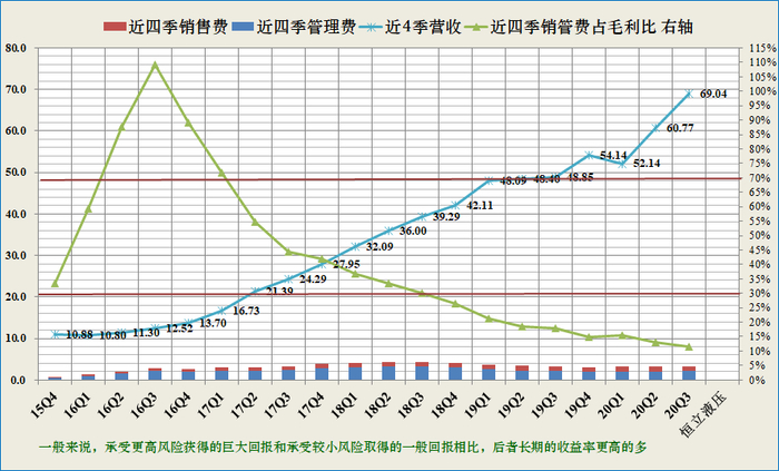 投资者可关注近四季销售和管理费用与毛利润之比持续小于30%的公司(绿线低于下红线为优异,靠近为优秀),具备较高的竞争优势,若30-70%之间为可接受区域(图中红色直线之间),若大于70%需要警惕,说明该公司产生净利润的能力较弱。