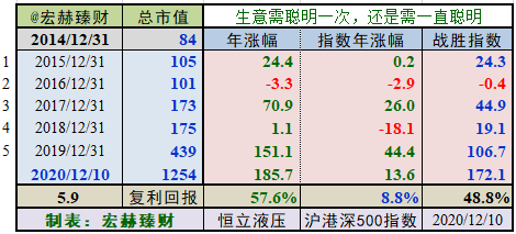 期初至今5.9年的光阴里市值从84亿增长至1254亿,实现年均复利回报率57.6%,同期指数年均增长8.8%。