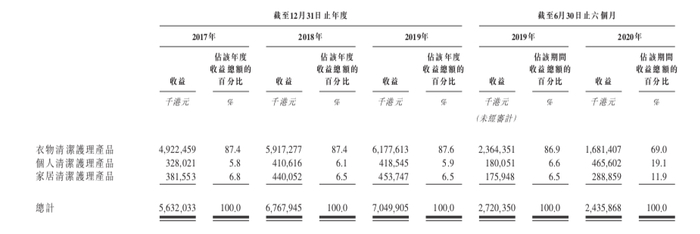 从收入结构上看,衣物清洁护理产品依旧为蓝月亮的营收主力军。2017年、2018年、2019年及2020年上半年,衣物清洁护理产品的销售收入分别为49.22亿港元、59.17亿港元、61.77亿港元与16.81亿港元,占总营收比例分别为87.4%、87.4%、87.6%与69.0%。