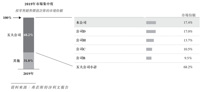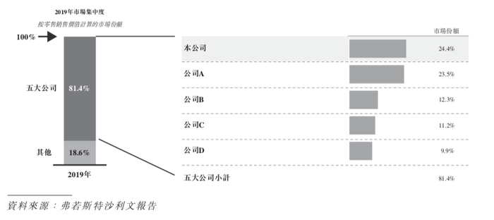 招股书显示,2019年,按照零售销售价值计算,中国洗衣液分布的五大洗衣液公司占整个市场的份额合计81.4%。其中,蓝月亮洗衣液的零售销售价值为66亿元,占中国洗衣液分部整体市场份额的24.4%,排名第一,排名第二的公司销售额占整体市场分额比例为23.5%。