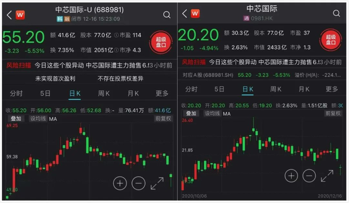 但受此消息影响,16日早盘,中芯国际(688981)一度跌幅近10%,随后跌幅收窄,截至收盘,报55.20元/股,大跌5.53%。中芯国际H股早盘在港交所临时停牌,午盘恢复交易,截至收盘,同样大跌4.94%。A+H股一日便蒸发超100亿市值。