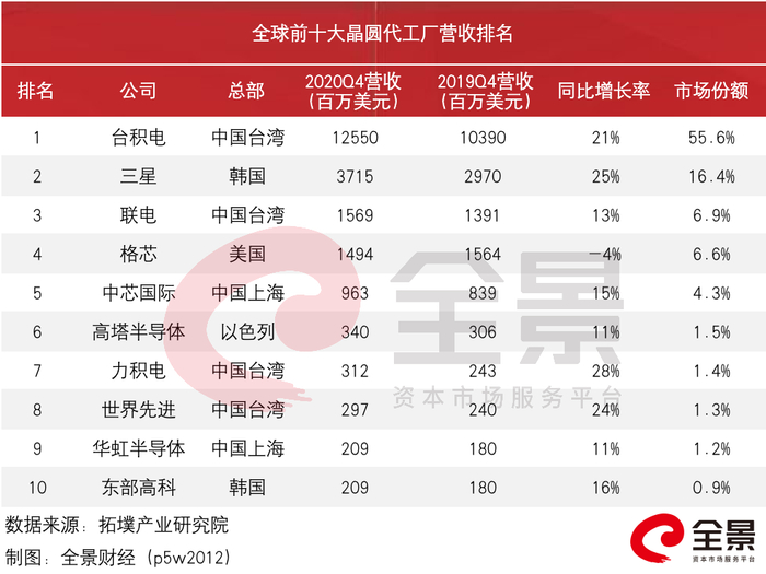 近日,拓墣产业研究院预测的2020年第四季全球前十大晶圆代工厂营收排名显示,台积电仍然稳坐钓鱼台,中芯国际排名未变,但总的市场份额较一季度减少0.2个百分点至4.3%。