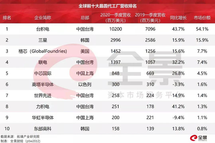 据市场调研机构拓墣产业研究院统计,2020年一季度全球十大晶圆代工厂营收排名中,中芯国际占总市场份额的4.5%,位列第五,而行业第一的台积电独占了54.1%的份额。
