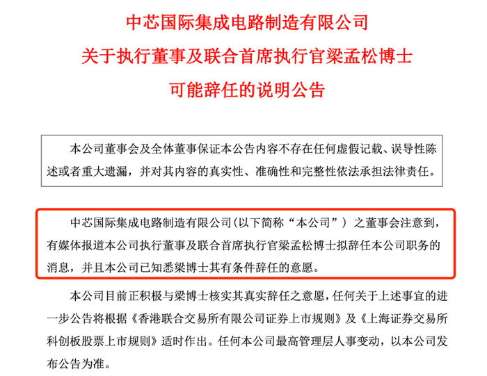 与此同时,中芯国际联合首席执行官兼执行董事梁孟松却被爆在大会现场提出辞职。