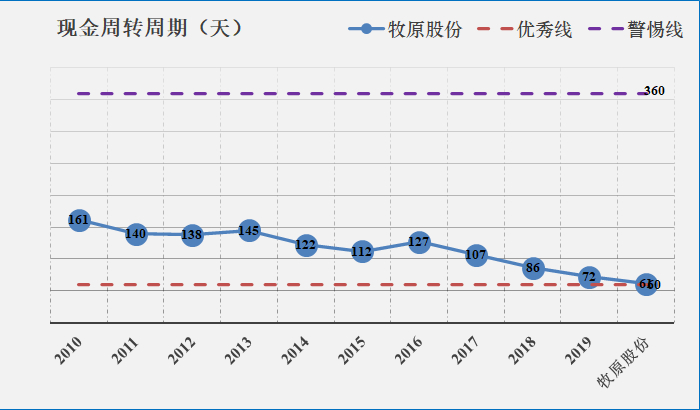 现金循环周期又可称为净营业周期,是考量企业日常运营环节的现金流状况,优先关注那些该指标小于60的企业,负数更为优,表示企业的还款周期远大于存货变现期。警惕该指标大于360的企业。