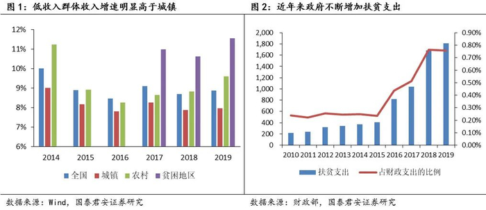 供给侧改革核心在于提高效率、优化产能,需求侧改革核心在于扩大内需、拉动消费,推动基数庞大的腰部及以下消费者的消费升级,从“吃饱穿暖”到追求高品质消费,进一步释放基础消费人群的消费潜力。需求侧改革核心是扩内需,通过需求侧改革牵引供给侧改革,提升国民经济整体效能。需求侧改革需要打通生产、流通、分配、消费等各个关键环节,优化收入分配机制、加强社会保障和再分配政策、改善居民可支配收入水平,扩大中等收入群体的消费能力,实现“供给和需求的有效匹配”。2017年以来,以农村和贫困地区为代表的低收入群体收入增速明显高于城镇,很重要的原因在于政府不断增加扶贫支出。根据财政部数据,2016-2020年我国连续五年每年新增中央财政专项扶贫资金200亿元,2020年达1461亿元,发挥了精准扶贫资金主渠道作用,2020年又一次性安排综合性财力补助资金300亿元,支持补齐挂牌督战地区脱贫攻坚短板弱项。