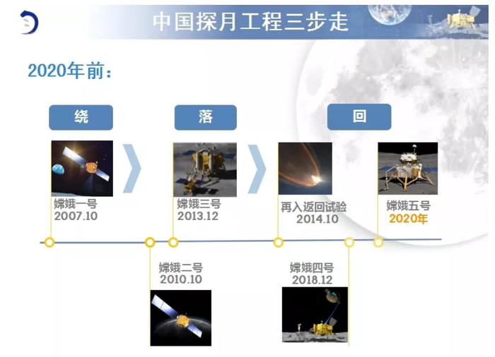 2004年1月,中国正式开展月球探测工程并命名为“嫦娥工程”,从此,中国的探月工程诞生了。工程规划为三期,简称“绕、落、回”,也就是绕月探测、月面探测、月球自动采样返回。在前两期规划中,中国已连续成功实施嫦娥一号、嫦娥二号、嫦娥三号、再入返回飞行试验和嫦娥四号等五次任务。