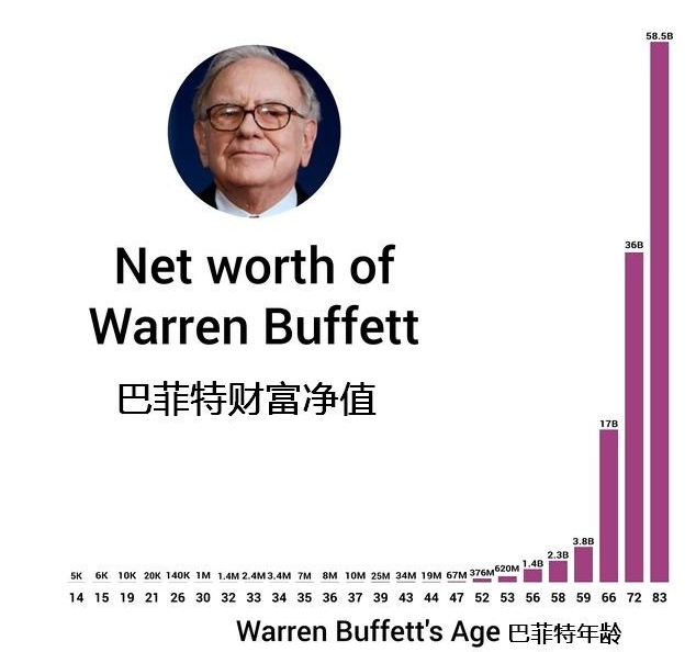 如果把巴菲特的财富增长做成柱状图,他50岁之前的财富增长也挺“平淡无奇”的,毕竟50岁身家几亿美元的富人太多了。