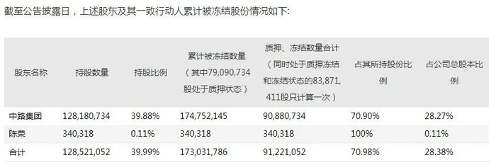 而根据其12月8日发布的公告来看,在这一连串“糖葫芦式”的冻结之下,中路集团及其一致行动人累计质押、冻结的上市公司股份达9122万股,占中路集团及其一致行动人所持上市公司股份的70.98%,占上市公司总股本的28.38%。