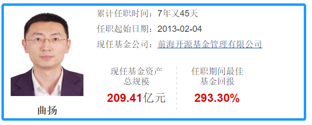 曲扬是2013年离开南方基金,加盟前海开源基金,是前海开源基金的元老级基金经理。累计担任基金经理7年多,现任前海开源基金联席投资总监、国际业务部负责人。