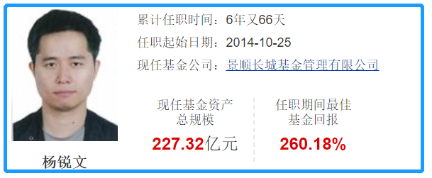 杨锐文自2010年进入景顺长城,从研究员做起到基金经理,是景顺长城内部培养出来的基金经理,现任股票投资部投资副总监,担任基金经理6年,从业12年。