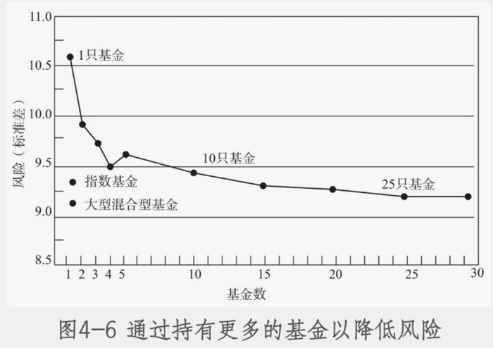 此前晨星公司统计一项研究数据表明,若持有超过4只随机选择的股票型基金,则不会明显地降低风险。下图所示,从持有10只基金开始,随着投资者持有基金数目的增加,不同基金组合的风险下降的非常有限了。