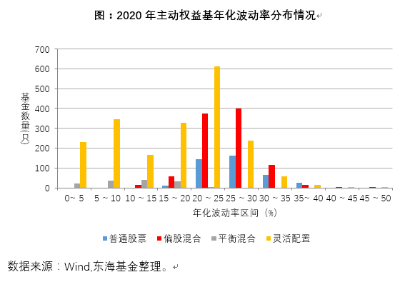 业绩波动方面,普通股票基金、偏股混合型基金、平衡混合型基金、灵活配置型基金今年以来平均波动率分别为27.38%、26.45%、17.26%、23.58%。从中可以看出,平衡混合型的年化波动率较低,基本在20%以内,分布也主要集中在10-15%区间,对应其收益率也相对较低,与其投资策略配置的股票比例相对较低有关。普通股票型和灵活配置项基金的波动主要集中在20-25%的区间。