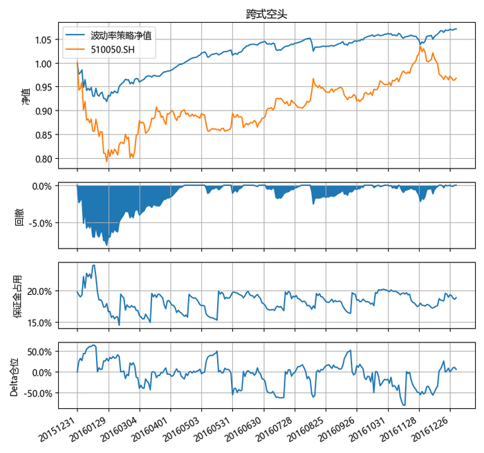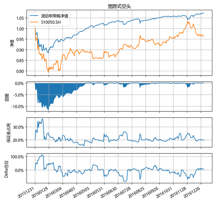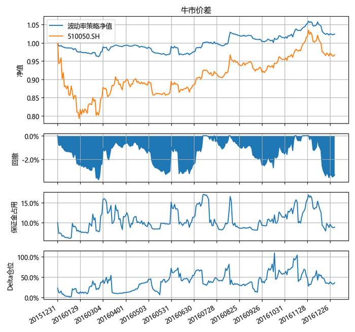 回测的策略以常见的价差策略,包括:①买入牛市价差;②买入熊市价差;③卖出跨式;④卖出宽跨式。这里不考虑对冲上的操作,只建仓并持有至到期前7天,然后移仓,建仓时保证Delta中性。
