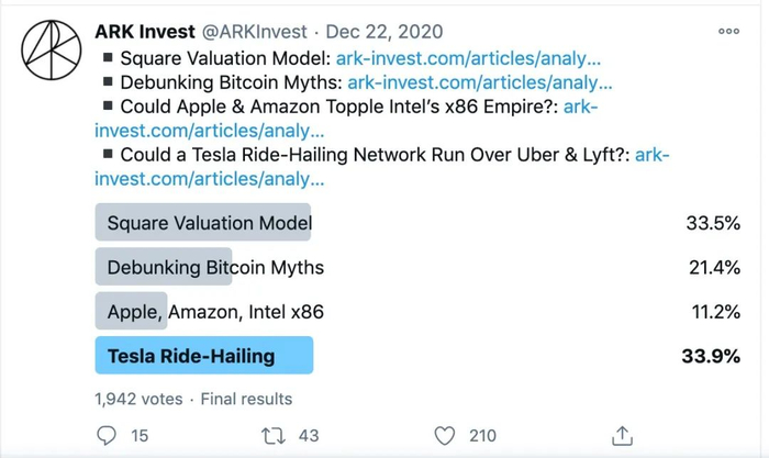 值得注意的是,伍德曾坚决反对埃隆·马斯克(Elon Musk)对特斯拉的私有化方案。2018年8月8日,马斯克发布内部信,称“正考虑以每股420美元、总价713亿美元的价格”将特斯拉私有化,并且已找到充足的资金来源。然而,伍德随后发表了一份措辞激烈的公开信,强烈反对特斯拉私有化,并重申特斯拉是很有投资价值的股票,“4000美元才是特斯拉应有的目标价”。她的观点最终影响了马斯克,令马斯克放弃了私有化方案。有趣的是,去年12月24日,马斯克曾重提私有化一事,他当时在推特回应一条推文时表示,“工程、设计、公司运营,这些事情已经令我筋疲力尽,几乎没有精力再做其他事情。”