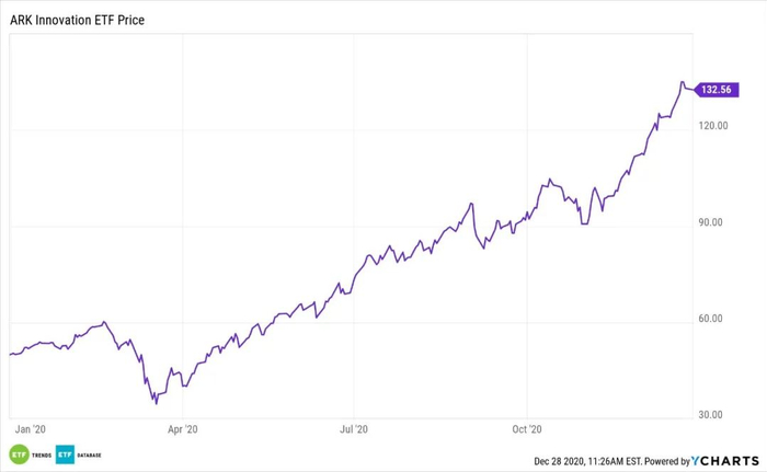 仅仅去年12月,Ark Innovation就增加了25亿美元的资产。Ark Innovation是Ark Invest的旗舰基金,在纽约股票交易所上市交易,代码为ARKK。今年以来,这只基金在新冠病毒疫情中的收益率超过170%,而这主要是由于特斯拉、Square、Teladoc等股票的表现强劲。