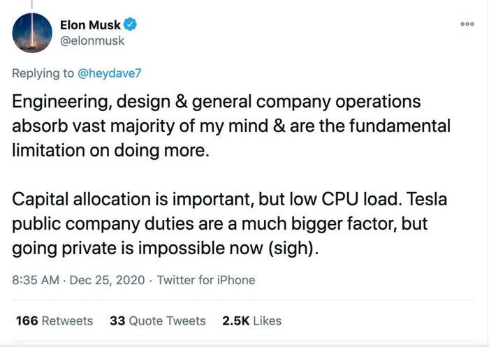 这条推文称马斯克应该在创新等领域优化自己的时间。“资本分配很重要,但CPU负荷太低。特斯拉作为上市公司的责任是更大的影响因素,但现在再想私有化是不可能的。”马斯克当时还提到, SpaceX旗下的Starlink是以后最有可能上市的。