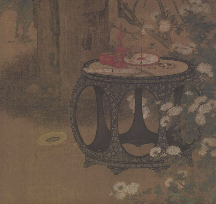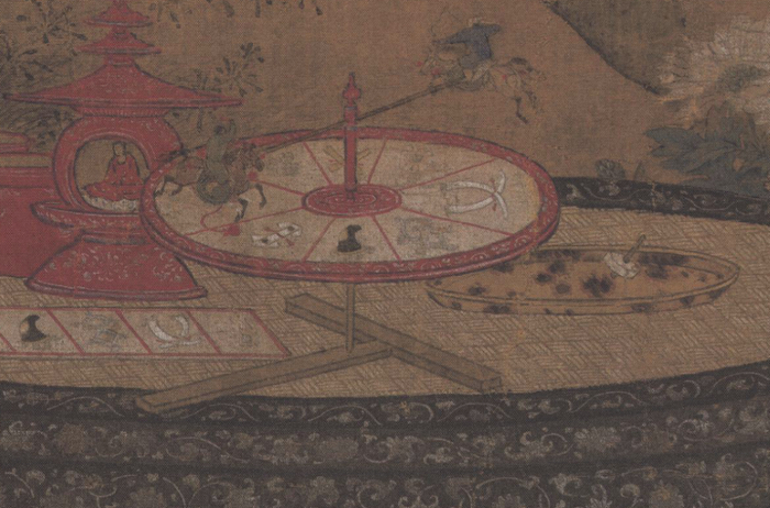 《秋庭戏婴图》中的圆凳上,就有一个供儿童玩耍的“人马转轮”,类似于市场上用于关扑的转盘。它由一个支架、一张转盘和一根人马造型的指针构成。拨动转盘,当它停下来时,上面的人马指针就会指向不同的图案。