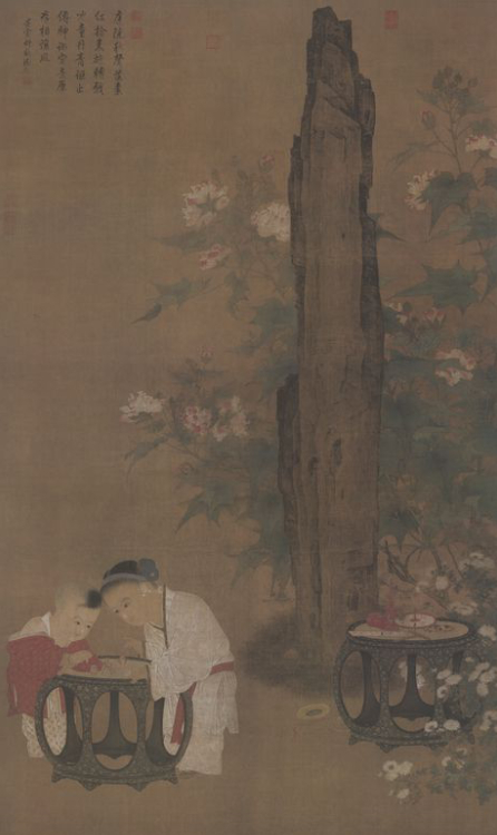 宋代画家苏汉臣的《秋庭婴戏图》,亦为我们展现了秋日里两孩童戏玩推枣磨的场景。