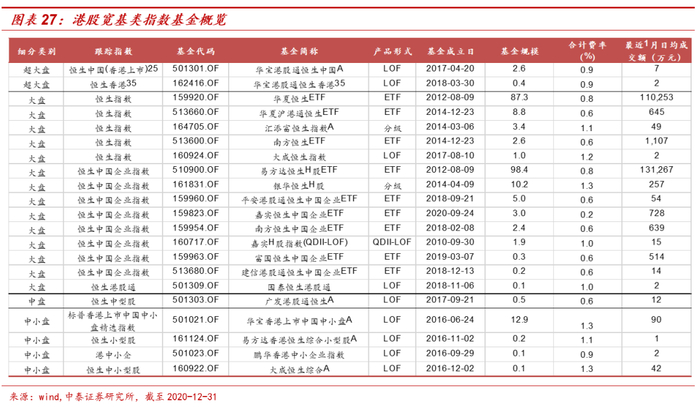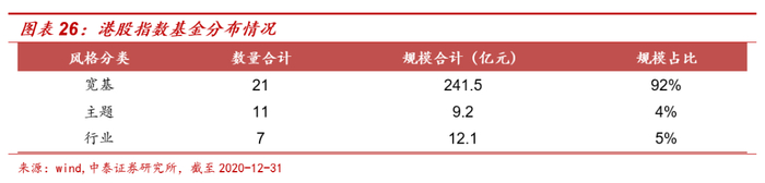 由此筛选出港股指数基金(不计入联接基金)合计39只,规模合计约263亿元。场内基金形式涵盖ETF和LOF,风格分类上有宽基、主题和行业。从场内外基金分类看:港股ETF规模占比最高,且近三年规模增速最快;港股LOF个数和规模小幅增加。从风格分类来看:港股宽基指数基金规模最大(占比92%),个数最多(21只);港股主题指数基金和港股行业指数基金规模和数量较少。此处及后文数据都截至2020年12月末。