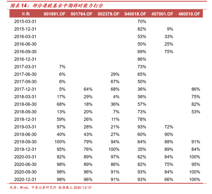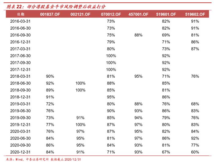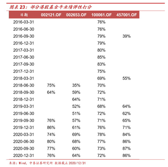 即对于基金半年公布的持仓数据,统计港股的持有比例,大于60%则认为当期为港股基金。对于时序上因子计算,考虑到港股基金个数相对较少,我们稍作容忍处理,在过去考察期内如果平均仓位在60%以上,那么这段时间则认为是港股基金。例如,要计算一个基金过去一年的指标,我们要求这段时间公布的港股持有比例数据均值在60%以上。