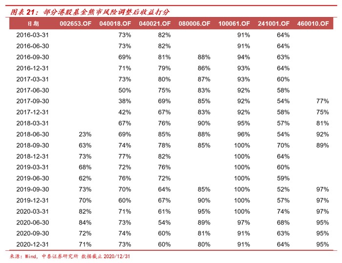 从牛市风险调整后收益角度来看,截止2020年12月31日,港股基金牛市进攻表现较好的几只基金分别为广发沪港深新起点A(002121.OF)、上投摩根香港精选港股通(005701.OF)与嘉实海外中国股票(070012.OF)。时序来看,海富通海外精选与嘉实海外中国股票时序上的熊市表现比较稳健,打分中枢分别为84.3%与81.5%。