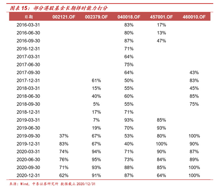 时序上看,不论从短期、中期还是长期择股能力来看,华安香港精选(040018.OF)、华泰柏瑞亚洲成长(460010.OF)、工银瑞信香港中小盘人民币(002379.OF)等能在时序上总体来说保持较高的同期排名,选股能力不管从横截面还是时序来看都相对稳定。历史中位来看,华安香港精选、南方香港成长、工银瑞信香港中小盘人民币短期选股打分中枢分别为69.93%、85.29%与76.6%;中期选股打分中枢分别为66.73%、88.64%与66.67%;长期选股打分中枢分别为69.93%、87.1%与76.6%;